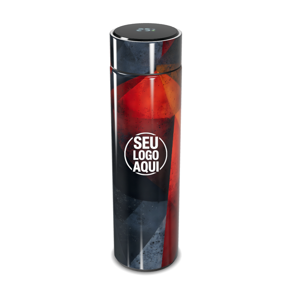 Garrafa térmica em aço inox com parede dupla 450ml com infusor, Display LED com termômetro digital na tampa para indicar a temperatura do líquido, Conserva líquido quente por até 5 horas e líquido frio até 7 horas