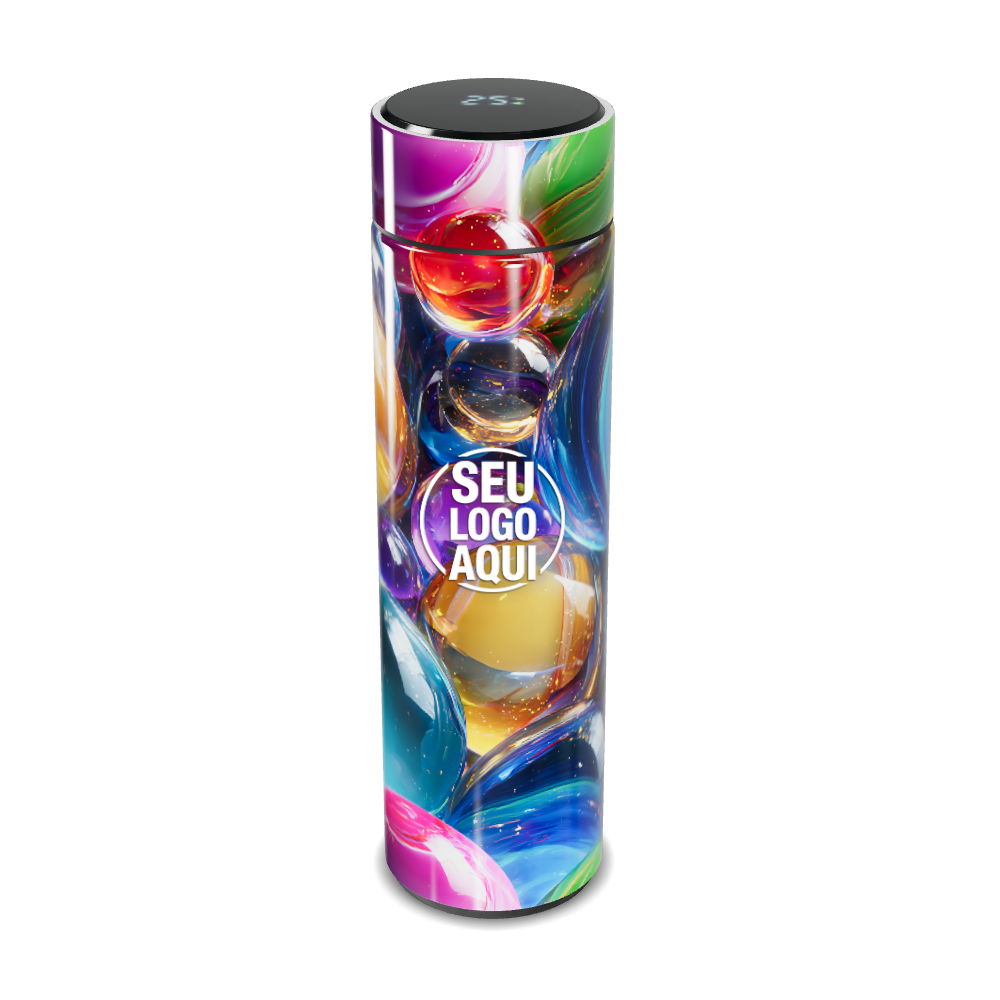 Garrafa térmica em aço inox com parede dupla 450ml com infusor, Display LED com termômetro digital na tampa para indicar a temperatura do líquido, Conserva líquido quente por até 5 horas e líquido frio até 7 horas