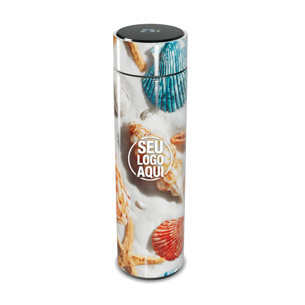 Garrafa térmica em aço inox com parede dupla 450ml com infusor, Display LED com termômetro digital na tampa para indicar a temperatura do líquido, Conserva líquido quente por até 5 horas e líquido frio até 7 horas