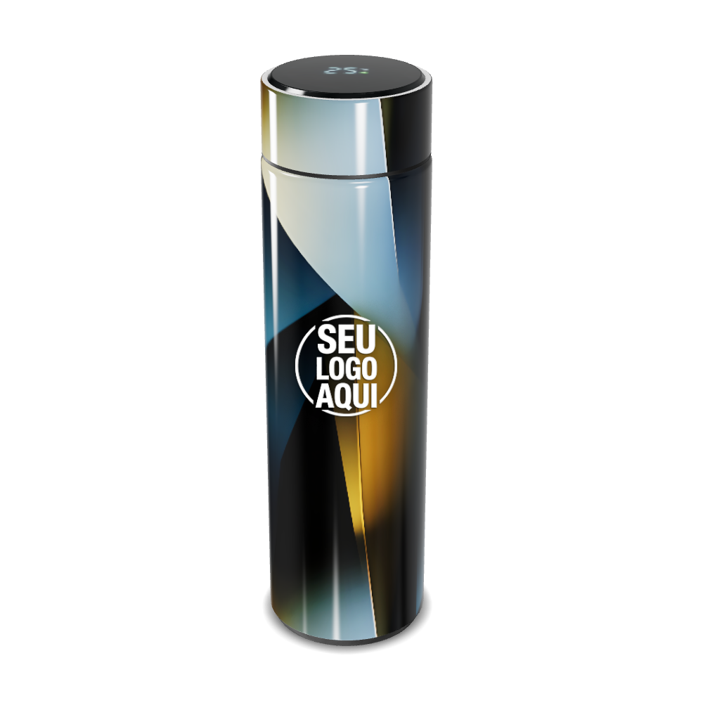 Garrafa térmica em aço inox com parede dupla 450ml com infusor, Display LED com termômetro digital na tampa para indicar a temperatura do líquido, Conserva líquido quente por até 5 horas e líquido frio até 7 horas