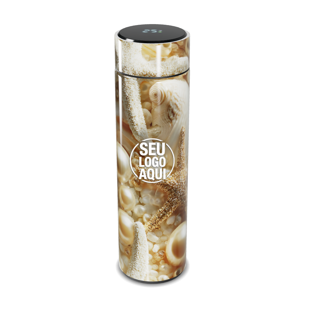 Garrafa térmica em aço inox com parede dupla 450ml com infusor, Display LED com termômetro digital na tampa para indicar a temperatura do líquido, Conserva líquido quente por até 5 horas e líquido frio até 7 horas