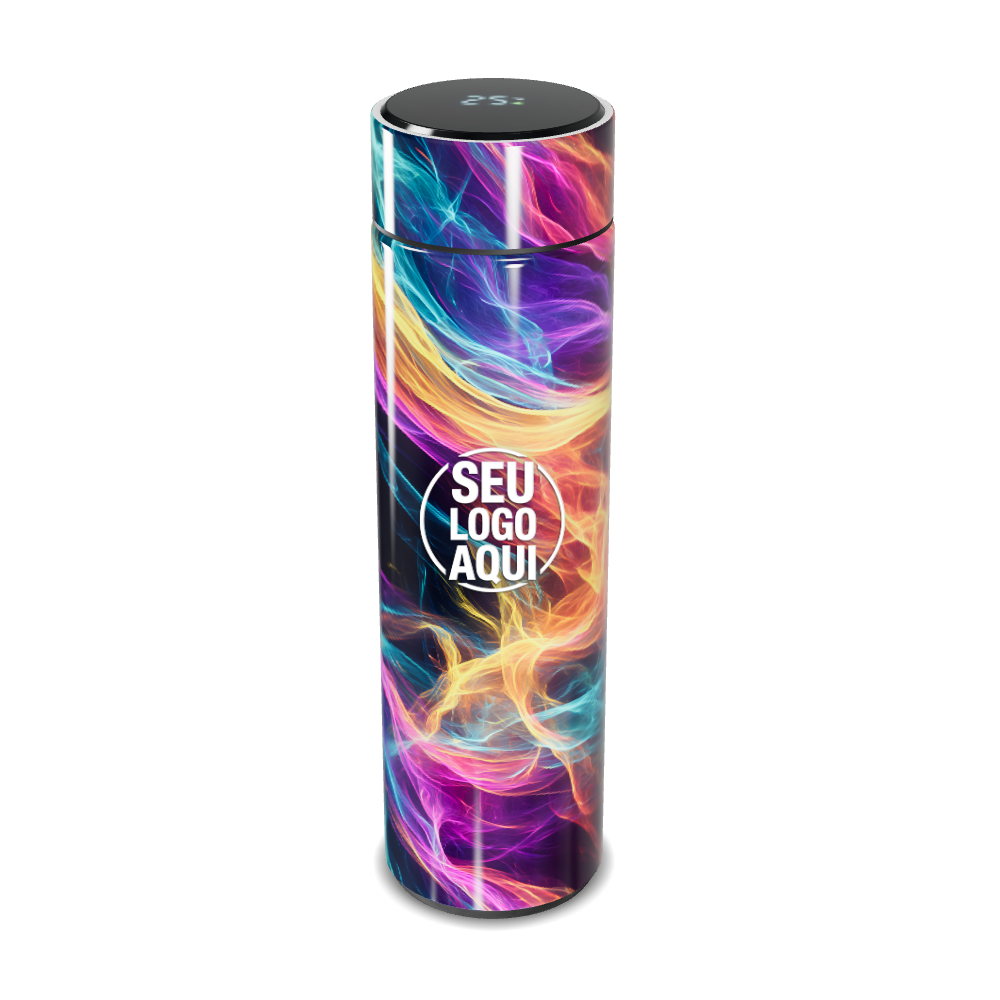 Garrafa térmica em aço inox com parede dupla 450ml com infusor, Display LED com termômetro digital na tampa para indicar a temperatura do líquido, Conserva líquido quente por até 5 horas e líquido frio até 7 horas