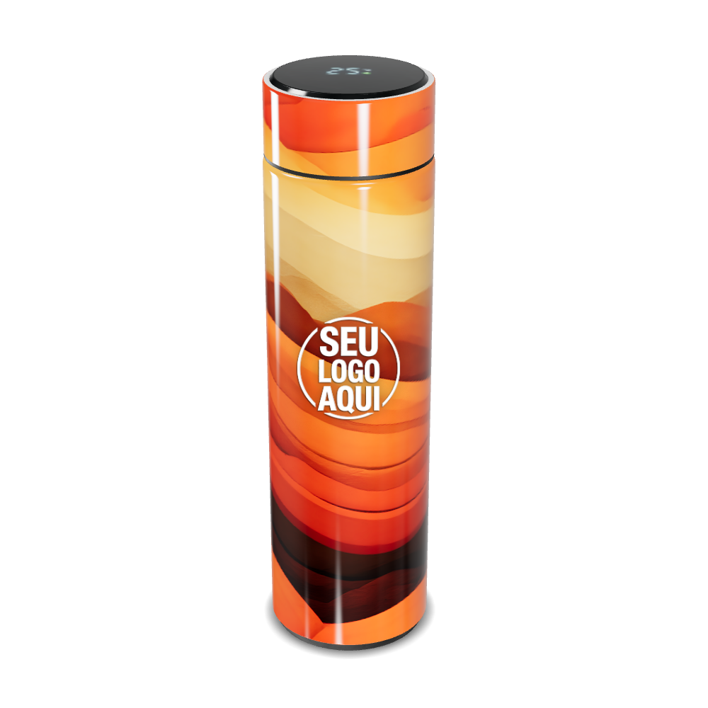 Garrafa térmica em aço inox com parede dupla 450ml com infusor, Display LED com termômetro digital na tampa para indicar a temperatura do líquido, Conserva líquido quente por até 5 horas e líquido frio até 7 horas