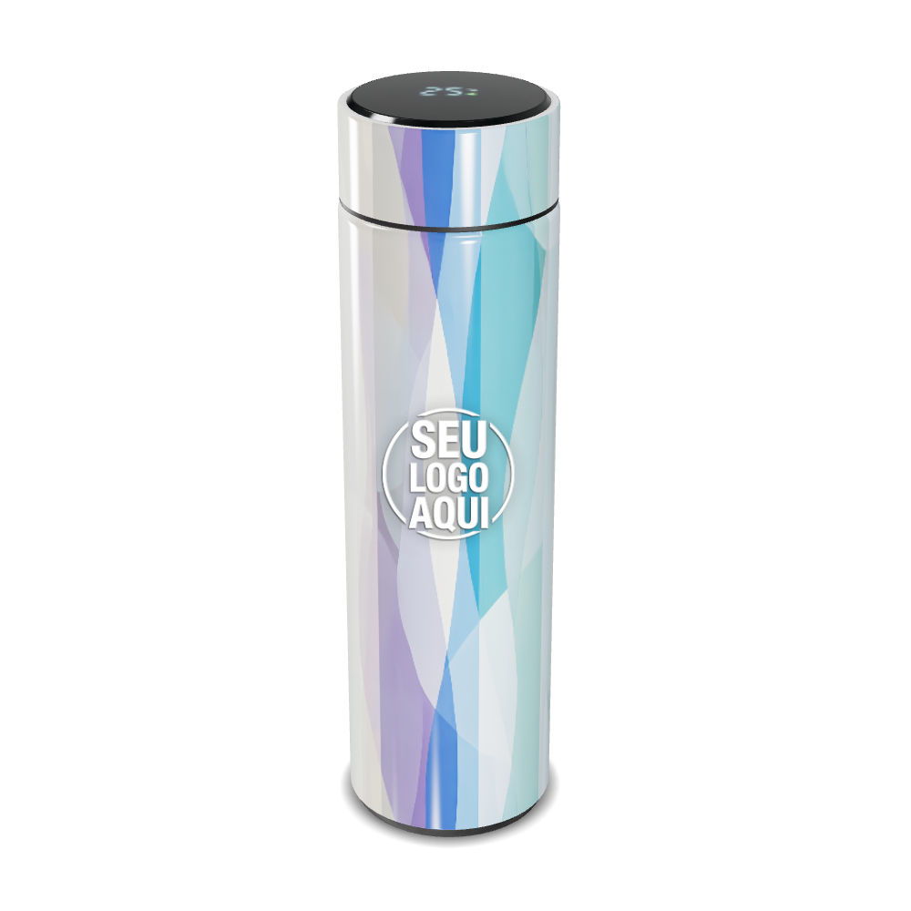 Garrafa térmica em aço inox com parede dupla 450ml com infusor, Display LED com termômetro digital na tampa para indicar a temperatura do líquido, Conserva líquido quente por até 5 horas e líquido frio até 7 horas