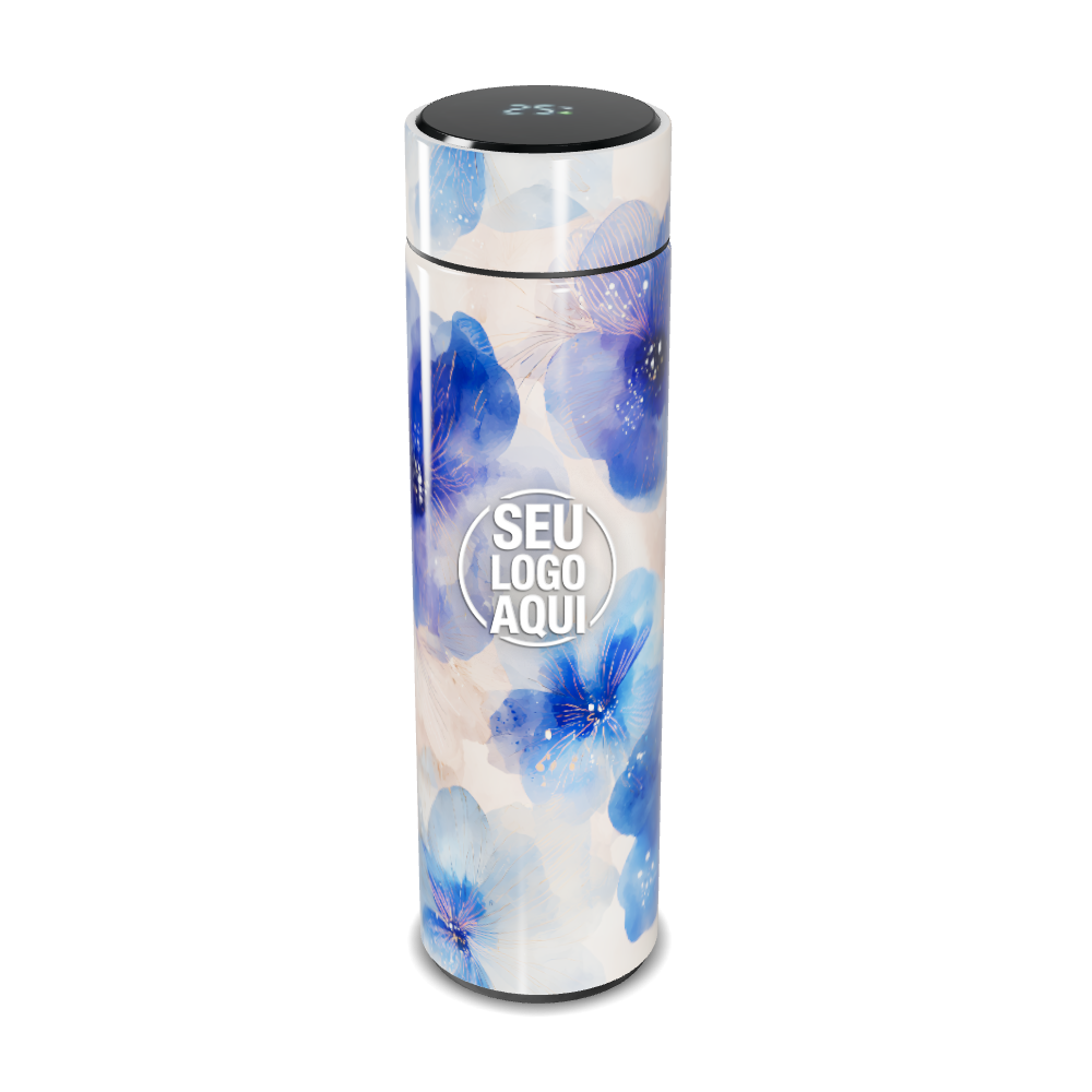 Garrafa térmica em aço inox com parede dupla 450ml com infusor, Display LED com termômetro digital na tampa para indicar a temperatura do líquido, Conserva líquido quente por até 5 horas e líquido frio até 7 horas