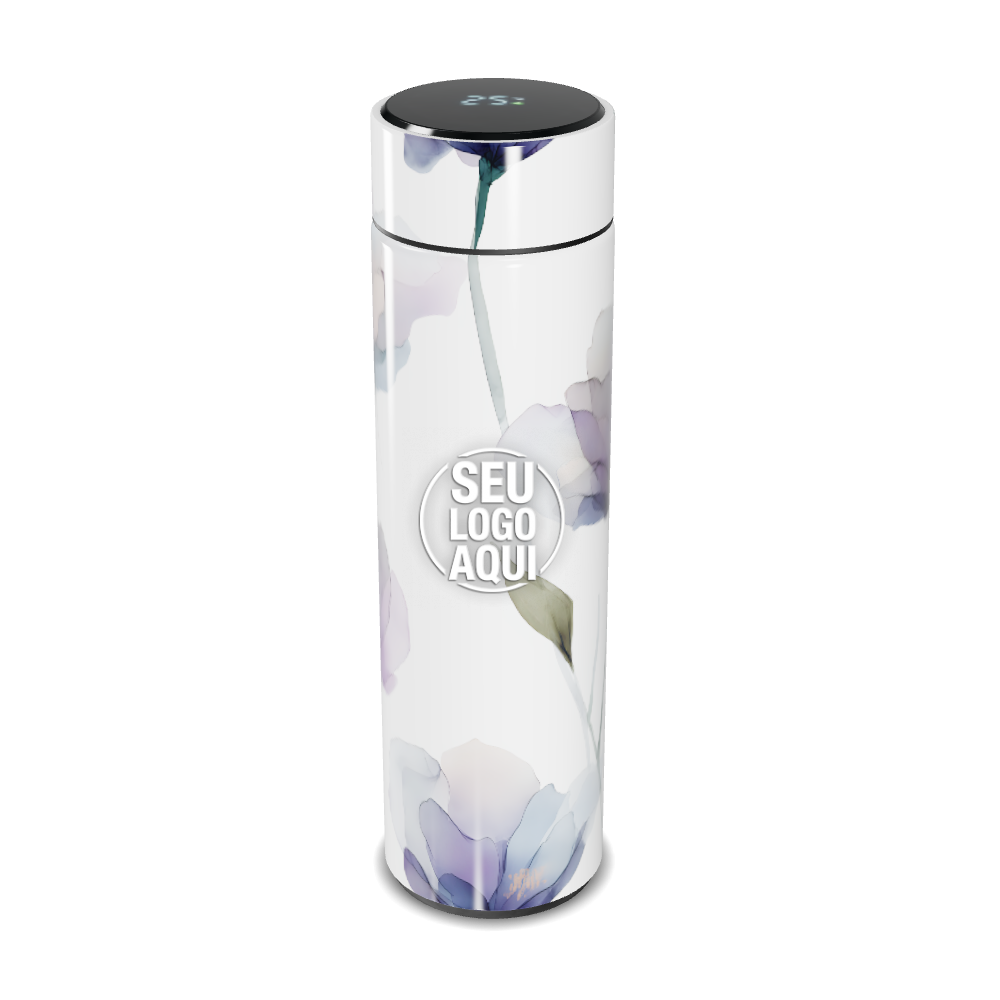 Garrafa térmica em aço inox com parede dupla 450ml com infusor, Display LED com termômetro digital na tampa para indicar a temperatura do líquido, Conserva líquido quente por até 5 horas e líquido frio até 7 horas