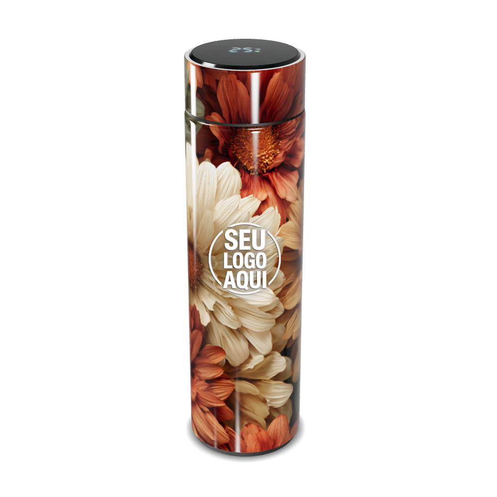 Garrafa térmica em aço inox com parede dupla 450ml com infusor, Display LED com termômetro digital na tampa para indicar a temperatura do líquido, Conserva líquido quente por até 5 horas e líquido frio até 7 horas