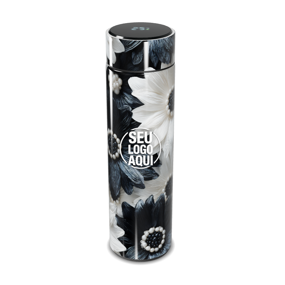 Garrafa térmica em aço inox com parede dupla 450ml com infusor, Display LED com termômetro digital na tampa para indicar a temperatura do líquido, Conserva líquido quente por até 5 horas e líquido frio até 7 horas