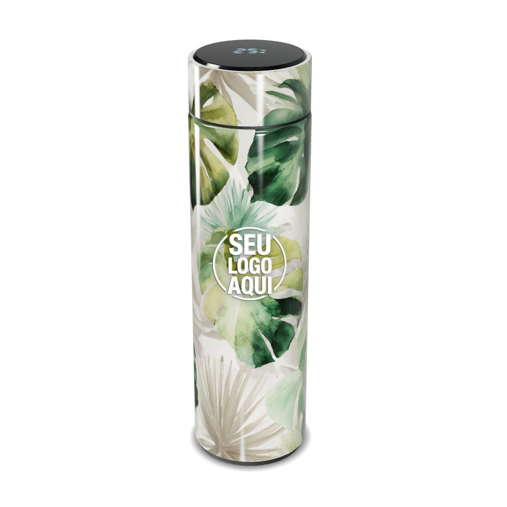 Garrafa térmica em aço inox com parede dupla 450ml com infusor, Display LED com termômetro digital na tampa para indicar a temperatura do líquido, Conserva líquido quente por até 5 horas e líquido frio até 7 horas
