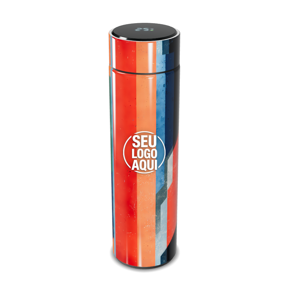Garrafa térmica em aço inox com parede dupla 450ml com infusor, Display LED com termômetro digital na tampa para indicar a temperatura do líquido, Conserva líquido quente por até 5 horas e líquido frio até 7 horas