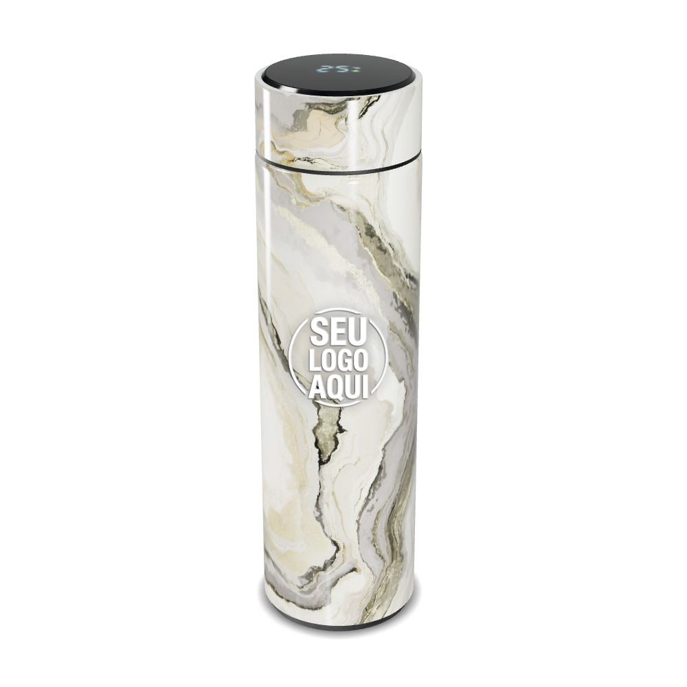 Garrafa térmica em aço inox com parede dupla 450ml com infusor, Display LED com termômetro digital na tampa para indicar a temperatura do líquido, Conserva líquido quente por até 5 horas e líquido frio até 7 horas