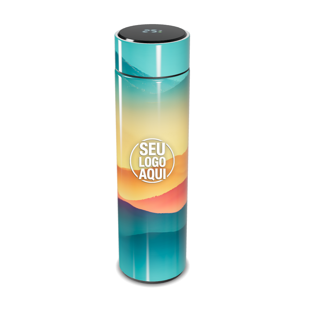 Garrafa térmica em aço inox com parede dupla 450ml com infusor, Display LED com termômetro digital na tampa para indicar a temperatura do líquido, Conserva líquido quente por até 5 horas e líquido frio até 7 horas