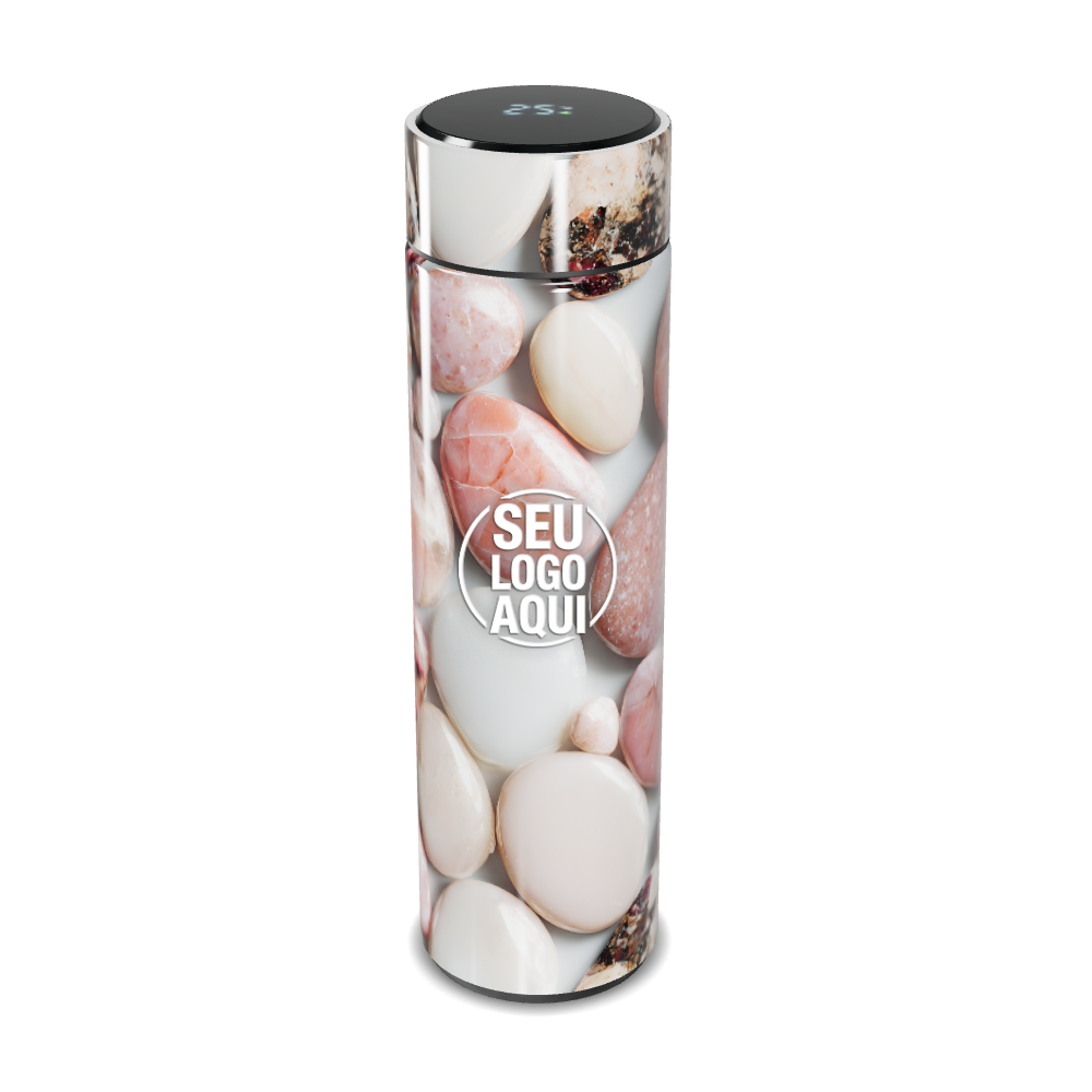 Garrafa térmica em aço inox com parede dupla 450ml com infusor, Display LED com termômetro digital na tampa para indicar a temperatura do líquido, Conserva líquido quente por até 5 horas e líquido frio até 7 horas