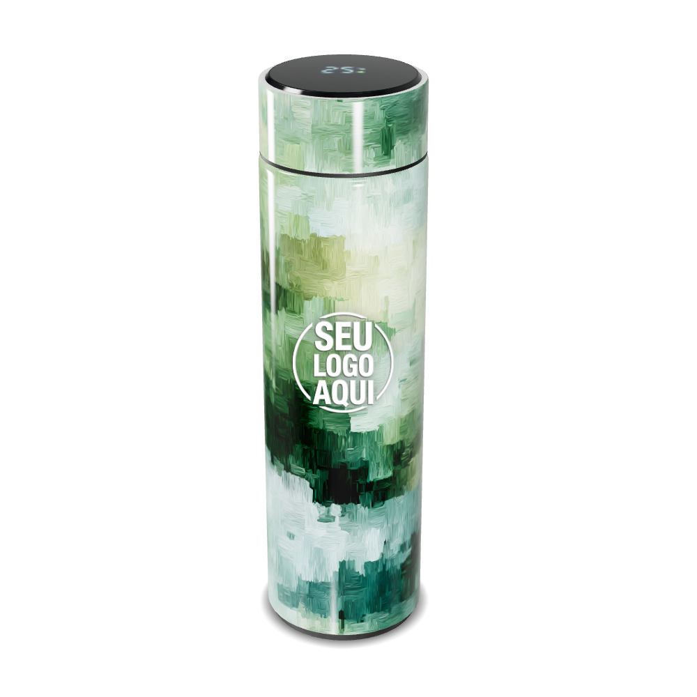 Garrafa térmica em aço inox com parede dupla 450ml com infusor, Display LED com termômetro digital na tampa para indicar a temperatura do líquido, Conserva líquido quente por até 5 horas e líquido frio até 7 horas
