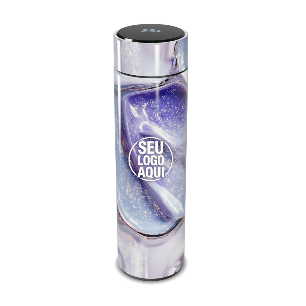 Garrafa térmica em aço inox com parede dupla 450ml com infusor, Display LED com termômetro digital na tampa para indicar a temperatura do líquido, Conserva líquido quente por até 5 horas e líquido frio até 7 horas