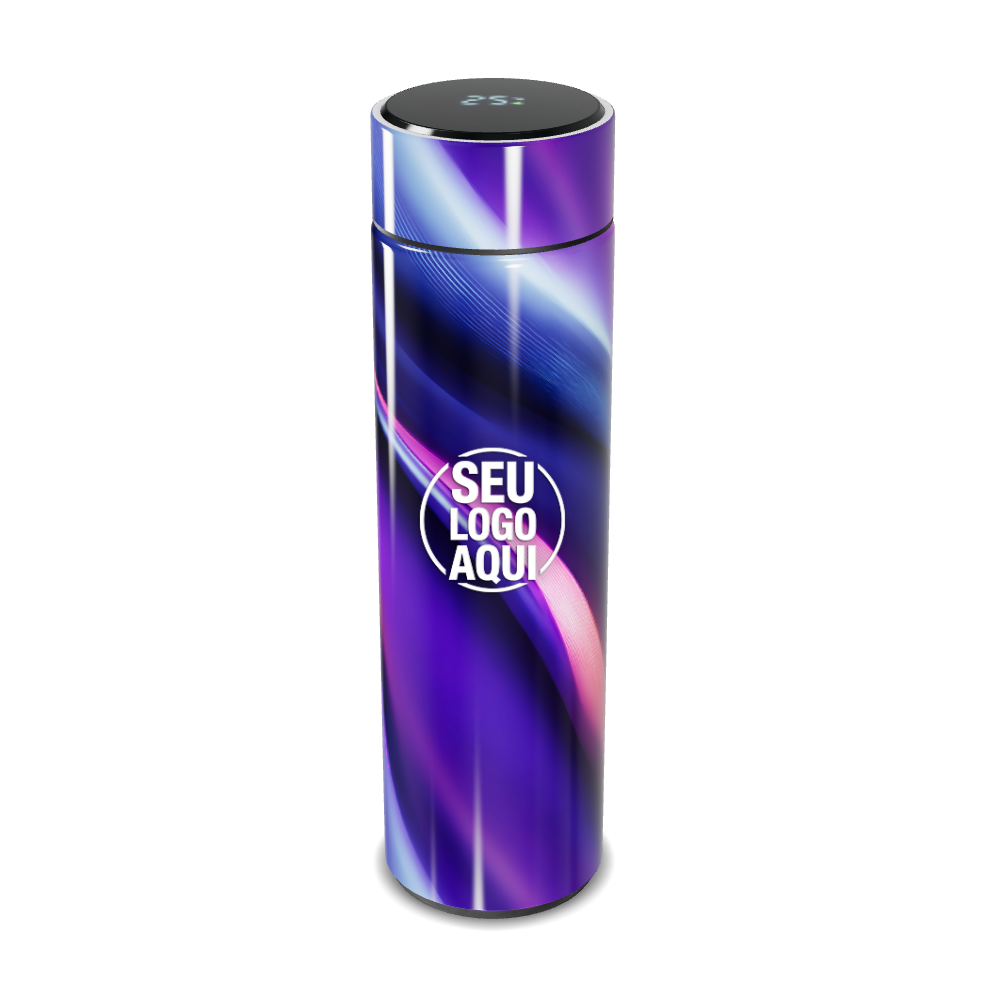Garrafa térmica em aço inox com parede dupla 450ml com infusor, Display LED com termômetro digital na tampa para indicar a temperatura do líquido, Conserva líquido quente por até 5 horas e líquido frio até 7 horas