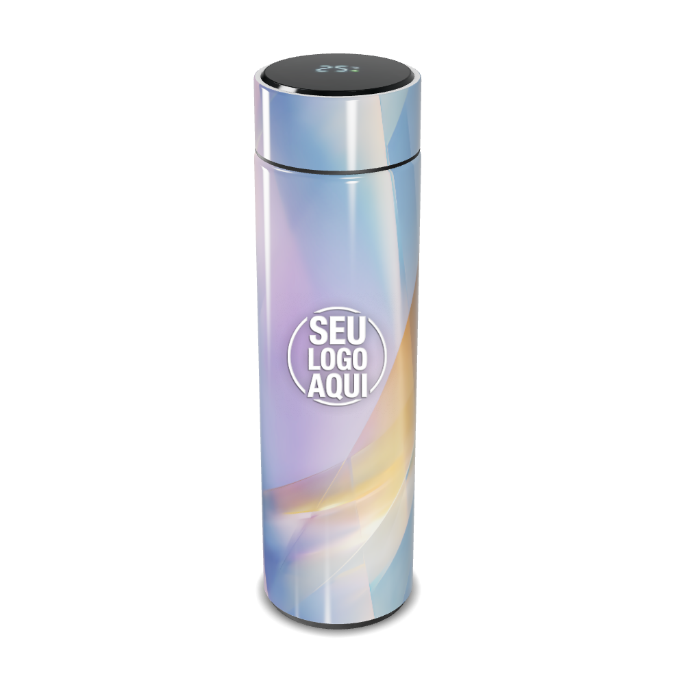 Garrafa térmica em aço inox com parede dupla 450ml com infusor, Display LED com termômetro digital na tampa para indicar a temperatura do líquido, Conserva líquido quente por até 5 horas e líquido frio até 7 horas