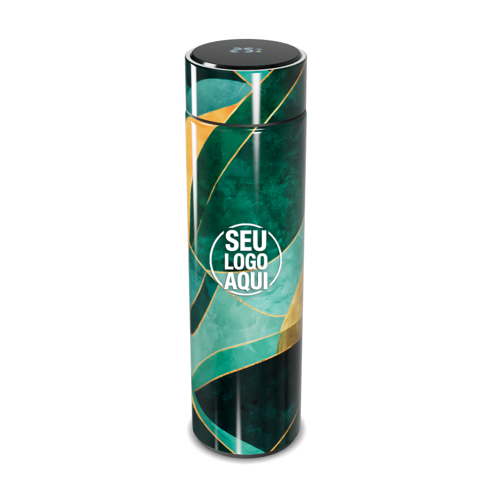 Garrafa térmica em aço inox com parede dupla 450ml com infusor, Display LED com termômetro digital na tampa para indicar a temperatura do líquido, Conserva líquido quente por até 5 horas e líquido frio até 7 horas