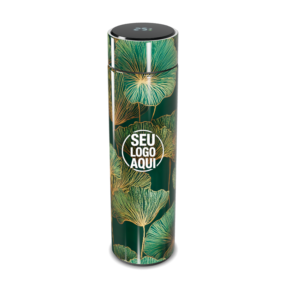 Garrafa térmica em aço inox com parede dupla 450ml com infusor, Display LED com termômetro digital na tampa para indicar a temperatura do líquido, Conserva líquido quente por até 5 horas e líquido frio até 7 horas