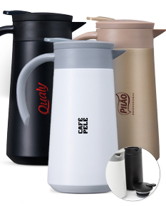Garrafa Térmica feita em Inox 304 com parede dupla e capacidade de 800m. Tampa rosqueável com alavanca que abre/fecha para servir a bebida.
