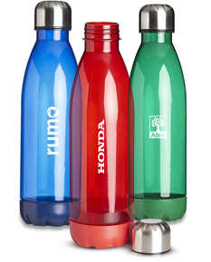 Garrafa translucida de plástico com capacidade para 700ml, possui uma base na respectiva cor leitosa e uma tampa de alumínio com rosca.
