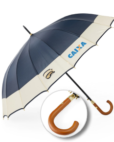 Guarda-chuva de poliéster com abertura automática, estrutura metálica com 16 varetas e pegador em madeira.