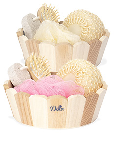 Kit banho com estilo natural, apresentado em um charmoso cesto de madeira. Inclui 4 itens essenciais para cuidados pessoais: escova de madeira com cerdas macias, pedra-pomes para esfoliação, esponja redonda e esponja de nylon. Ideal para um momento relaxante de autocuidado.