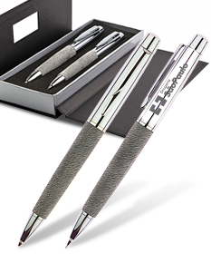Kit caneta e lapiseira de metal com detalhe em papel reciclado. Ambas peças com acionamento por giro. Acompanha estojo de papelão resistente com metal e berço.