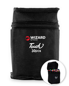 Kit com 30 canetas marcadoras feitas em plástico com pontas duplas: uma fina e outra chanfrada. Acompanham bolsa com alça e fechamento em zíper para transporte.