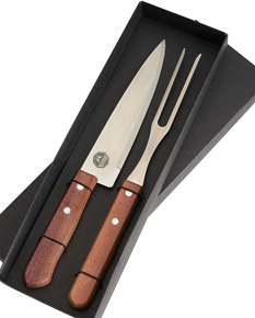 Kit churrasco duas peças em estojo de papel kraft com elásticos de nylon para fixação dos talheres, contém faca e garfo.