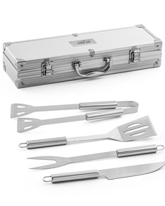 Kit churrasco com maleta de alumínio. Contém espátula, pegador, garfo e faca em inox (todas peças possuem proteção plástica).