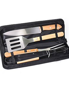 Kit churrasco 4 peças em estojo de nylon com alça. Contém pegador, garfo, faca e espátula de madeira.