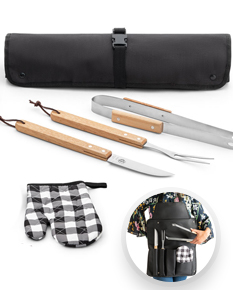 Kit churrasco composto por 4 utensílios: faca, garfo e pinça em aço inox e madeira de Seringueira e uma luva de cozinha. O estojo dobrável em 600D pode ser convertível em avental para sua proteção.