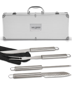 Kit churrasco com maleta de alumínio. Contém espátula, pegador, garfo e faca em inox (todas peças possuem proteção plástica).