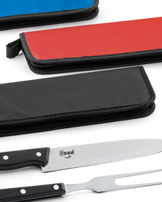 Kit churrasco em aço inox e PP. Possui 2 peças em estojo de Nylon 210D.