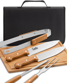 Kit churrasco em aço inox e madeira. Possui tábua em bambu e 5 peças em estojo de 210D. Medida da tábua: 300 x 200 x 12 mm.