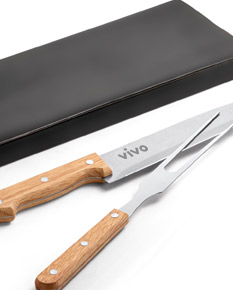 Kit churrasco em aço inox e bambu. Possui caixa kraft e 2 peças.