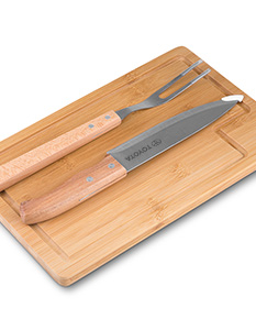 Kit churrasco 3 peças com estojo. Contém faca, garfo e pegador.