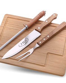 Kit Churrasco com 3 peças e tábua de bambu.
