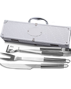 Kit churrasco com maleta de alumínio. Contém espátula, pegador, garfo e faca em inox (todas peças possuem proteção plástica).