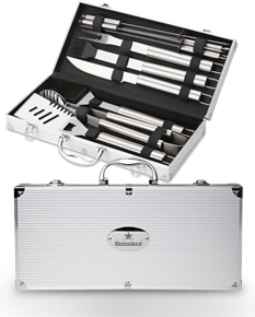 Kit churrasco 10 peças em maleta de alumínio com travas de segurança e placa central para personalização. Contém: espátula, pegador, escova para grelha, faca, pincel, garfo e quatro espetos, parte interna da maleta com revestimento em TNT e suportes de velcro para fixação das peças.