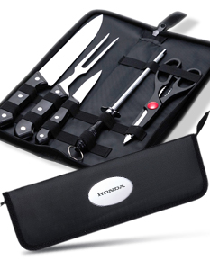 Churrascos irresistíveis começam com os utensílios certos! Nosso kit de 5 peças em inox, com cabos plásticos e estojo em nylon, inclui: uma faca chef de 7 polegadas, versátil para diversas tarefas na cozinha; uma faca de legumes de 3 polegadas, ideal para descascar e cortar vegetais; um garfo perfeito para dominar a grelha; uma chaira, essencial para manter as facas sempre afiadas; e uma tesoura multiuso para cortar alimentos, legumes, verduras e carnes. Além disso, a tesoura possui pequenos dentes entre os cabos que funcionam como um quebra-nozes. O kit também acompanha uma plaquinha de metal, permitindo personalizar e dar um toque único ao churrasco. Este kit é perfeito para preparar churrascos deliciosos!