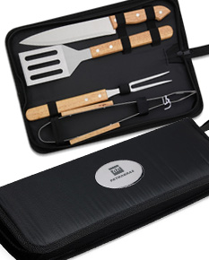 Kit churrasco 4 peças em estojo de nylon com alça. Possui: pegador, garfo, faca e espátula de madeira, acompanha plaquinha para personalização, proteções plásticas(faca e garfo) e parte interna com elástico para guardar as peças.
