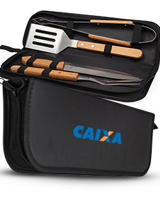 Prepare churrascos memoráveis e deliciosos com o nosso kit com quatro peças essenciais: espátula, garfo, pegador e faca de 7 polegadas, todas em aço inox com cabos de madeira, acomodadas em um estojo de nylon que facilita o armazenamento e transporte. Para maior exclusividade, acompanha uma plaquinha metálica personalizável com verso autoadesivo.