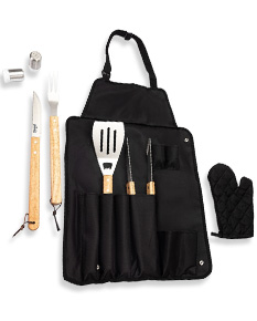 Kit churrasco 8 peças em estojo de nylon. Contém espátula, garfo, faca, pegador, saleiro, paliteiro, luva e avental (também utilizado como estojo). Talheres de inox com acabamento de madeira e avental de nylon com alça ajustável – possui botão e alça com fivela para lacre.