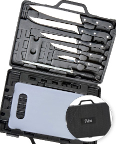 Um kit completo para ajudar na preparação de um churrasco inteiro e deixar o momento de confraternização ainda melhor. Este conjunto traz 7 itens, incluindo 1 tábua em plástico, 1 chaira em aço inox, e 5 facas em tamanhos diferentes do mesmo material: 1 faca de legumes (com 3 polegadas de lâmina), 1 faca de cozinha (com lâmina de 4 polegadas), 1 faca de desossar (com lâmina de 5 polegadas), 1 faca trinchante (com lâmina de 7 polegadas) e 1 faca peixeira (com lâmina de 8 polegadas). Tudo isso acompanhada por uma elegante maleta para facilitar a organização e o transporte do kit.