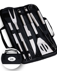 Um kit ideal para acompanhar momentos de confraternização marcantes que apenas um bom churrasco pode proporcionar. O nosso kit traz 5 itens em aço inox indispensáveis para preparar um bom churrasco: 1 faca de 6,2 polegadas de lâmina, um garfo, 1 espátula, 1 pincel com cerdas de silicone e 1 pegador. Além disso, ele acompanha um estojo de nylon com um par de alças fixas para dar maior facilidade de transporte, além de uma placa metálica personalizável com verso autoadesivo.