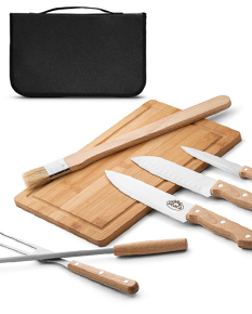 Prepare churrascos memoráveis e deliciosos com o nosso kit com quatro peças essenciais: espátula, garfo, pegador e faca de 7 polegadas, todas em aço inox com cabos de madeira, acomodadas em um estojo de nylon que facilita o armazenamento e transporte. Para maior exclusividade, acompanha uma plaquinha metálica personalizável com verso autoadesivo.
