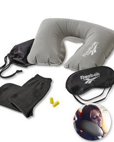 Kit de viagem composto por almofada de pescoço, máscara para dormir, tampões para ouvidos (não é um equipamento de proteção individual) e 1 par de meias