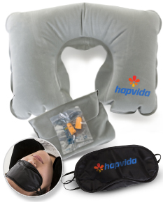 Kit viagem com 3 peças, contém: travesseiro inflável(revestido de veludo), máscara para olhos de cetim(revestido com espuma) e um par de protetor auricular. Travesseiro colorido, máscara sempre preta e protetor sempre laranja. Acompanha uma necessaire colorida de veludo para guardar o kit.